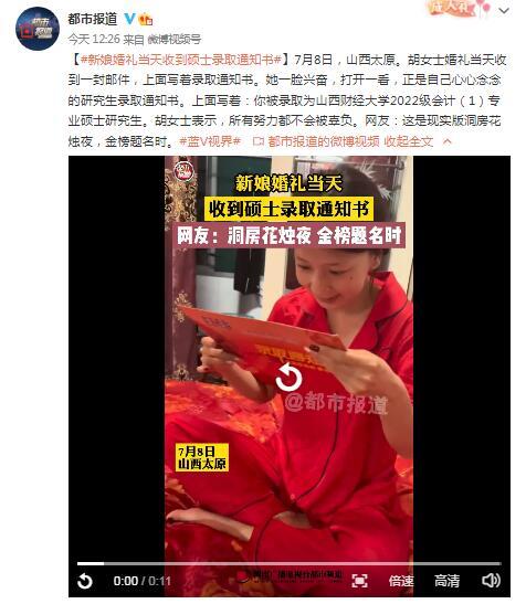 【#新娘婚礼当天收到硕士录取通知书#】7月8日,山西太原。胡女士婚礼当天收到一封邮件,上面写着录取通知书。她一脸兴奋,打开一看,正是自己心心念念的研究生录取通知书。上面写着:你被录取为山西财经大学2022级会计(1)专业硕士研究生。胡女士表示,所有努力都不会被辜负。网友:这是现实版洞房花烛夜,金榜题名时。