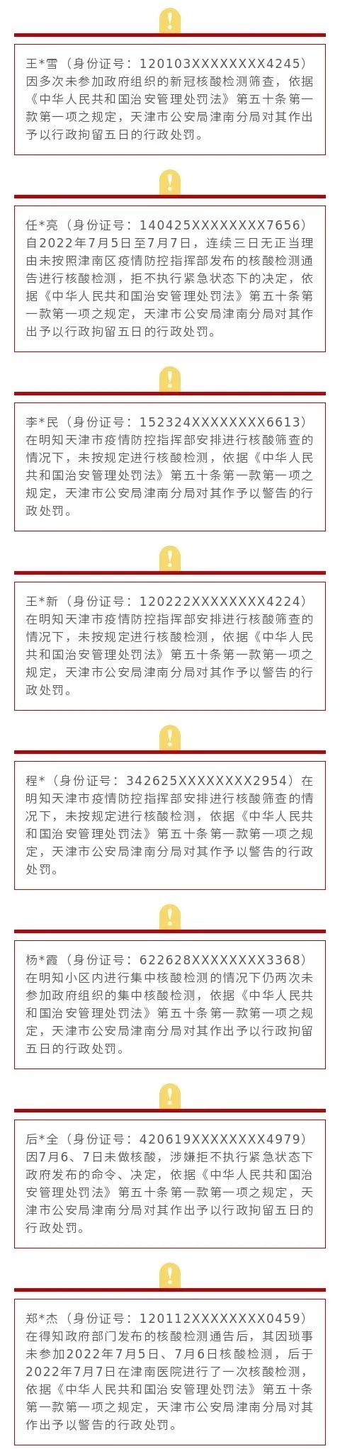 近日,在天津市部分区域组织的全域核酸检测中,有个别人员未按时参加核酸筛查,给疫情防控带来风险。据不完全统计,河东区有14人无故不参加筛查被训诫并责令补测,西青区有123人被训诫,津南区有8人被拘留或警告,并由有关部门纳入个人诚信记录。日前,“信用天津”曝光了部分人员的失信情况。