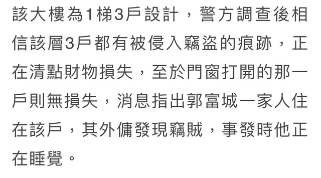 这栋公寓是一梯三户的设计,被盗的不止是郭富城一家,整层楼的三户人家都有被盗窃的痕迹,而因为郭富城家有佣人及时发现,所以只有郭富城家没有遭受损失。