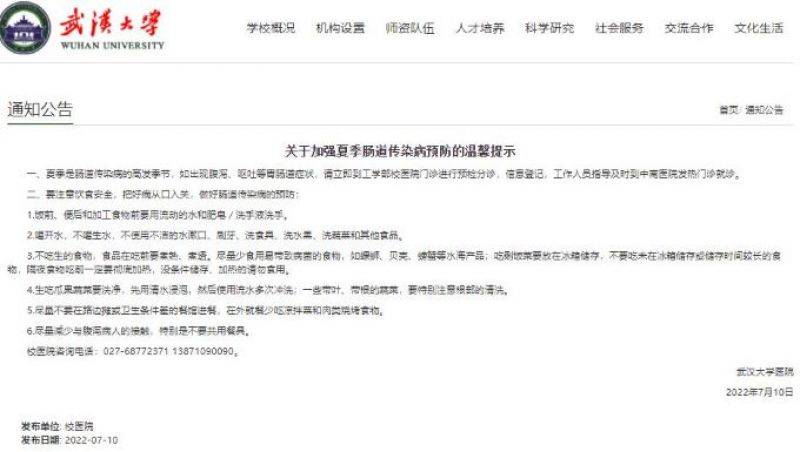 据武汉大学官网消息,7月10日,武汉大学医院发布关于加强夏季肠道传染病预防的温馨提示。