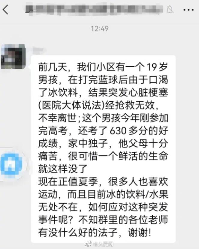 福州19岁的男孩小辉今年高考结束后,坚持每天打篮球,流一身汗后喝一瓶冰饮料。近日,小辉依旧在打完篮球后拿起一瓶冰饮料一口气喝光。喝完不到五分钟,小辉开始感觉到胸闷胸痛,被送往医院抢救,最终因急性心梗抢救无效去世。医生:夏季气温高时,人体血管处于扩张状态,如果在剧烈运动后,马上喝大量温度极低的冷饮,或是即刻吹空调、洗冷水澡,可能导致全身血管立即收缩痉挛,血压突然升高,血液黏稠度增高,出现凝血,引起血管堵塞,诱发心绞痛和心肌梗死。(福建卫生报)19岁男孩运动后猛喝冰饮料不幸去世!医生紧急提醒:正值夏季,不要做这些事…
