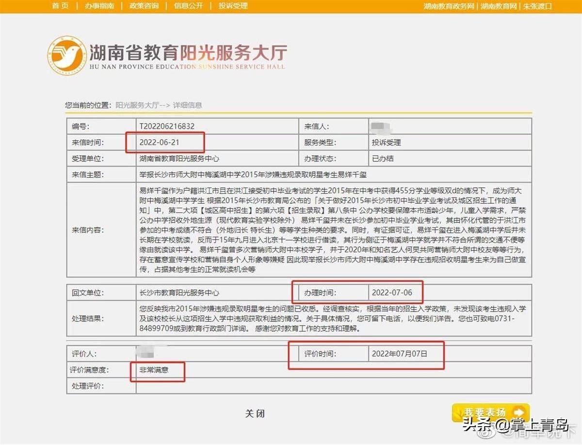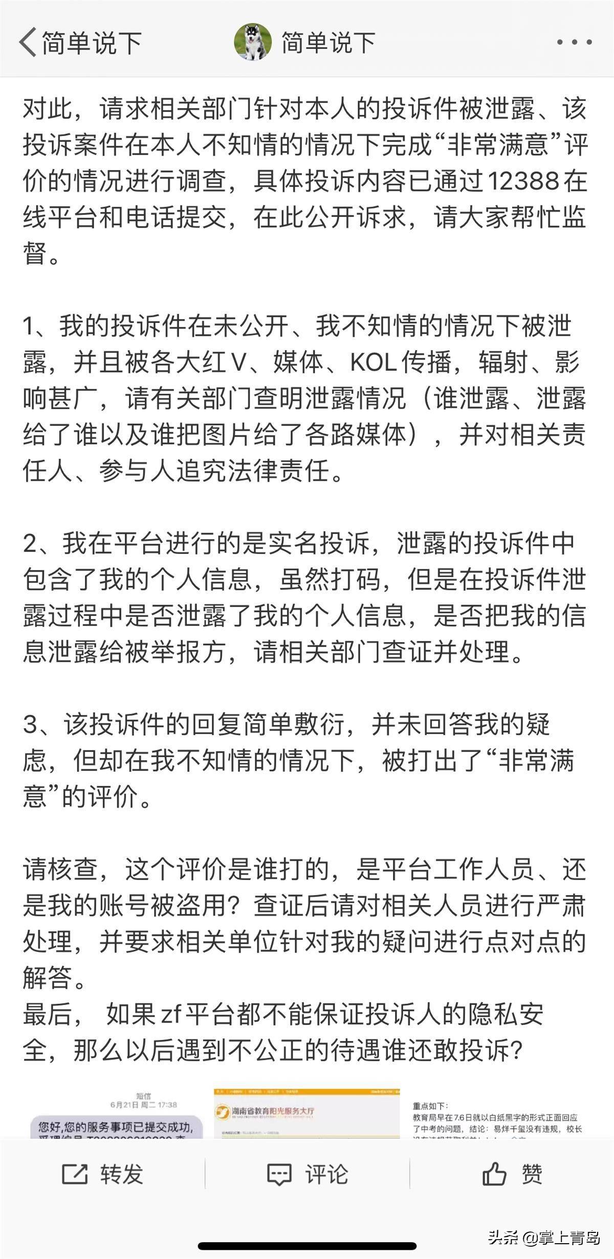 “简单说下”认为,根据湖南省教育厅文件规定,相关投诉的处理进度、反馈结果,只有投诉者本人可以凭借投诉认可短信中的“查询码”查询,且结果只有投诉者本人才能看到,“本人没有授权相关部门进行公开,且网站上根本无法公开查询,那么流传到网络上的截图从何而来?”