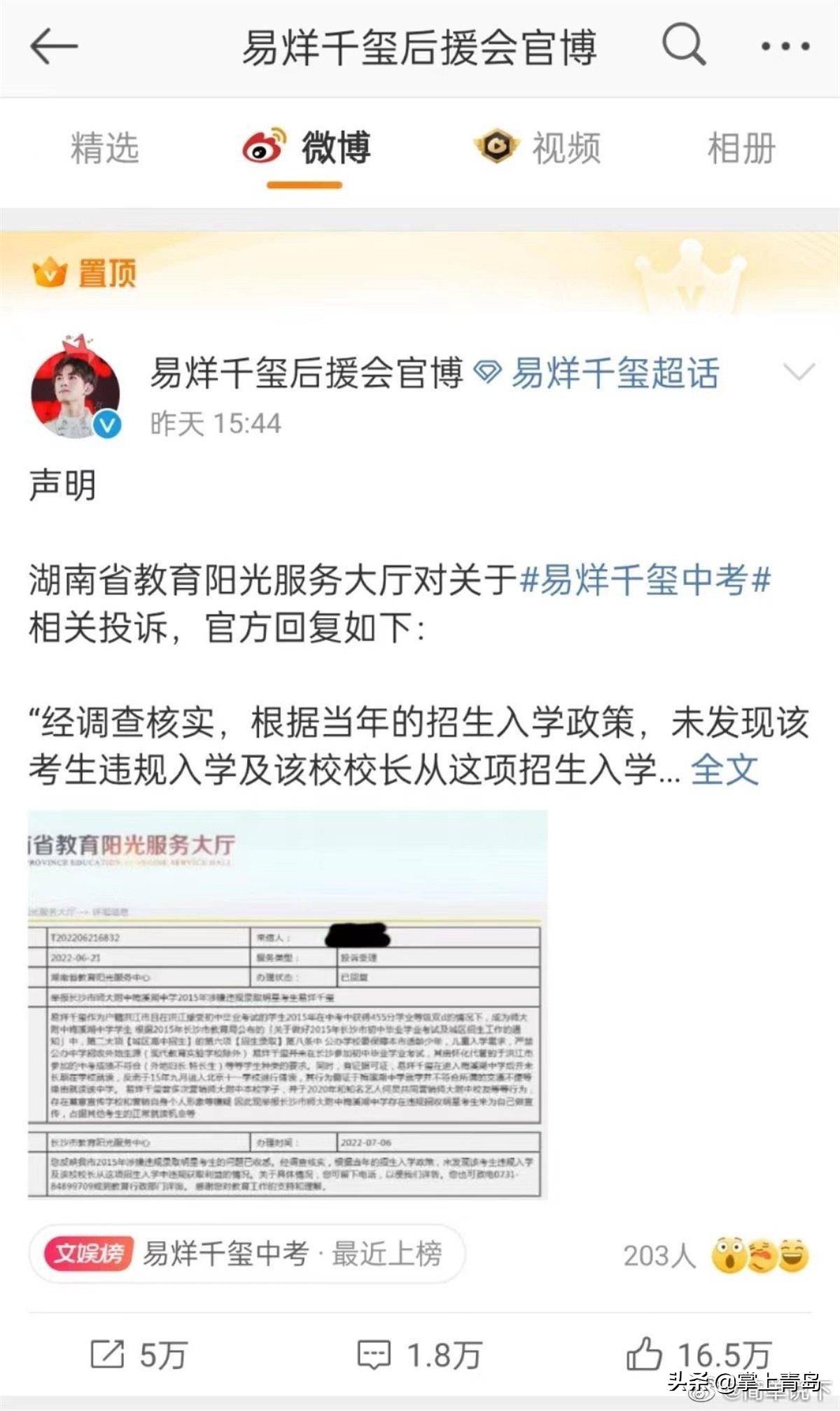 7月8日,网友“简单说下”在微博提到,自己于6月21日在湖南省教育阳光服务大厅填写的“有关易烊千玺中考违规入学”投诉举报件,其回复内容在尚未公开且她并不知情的情况下,于7月7日被易烊千玺后援会和一些娱乐大V公开并传播。
