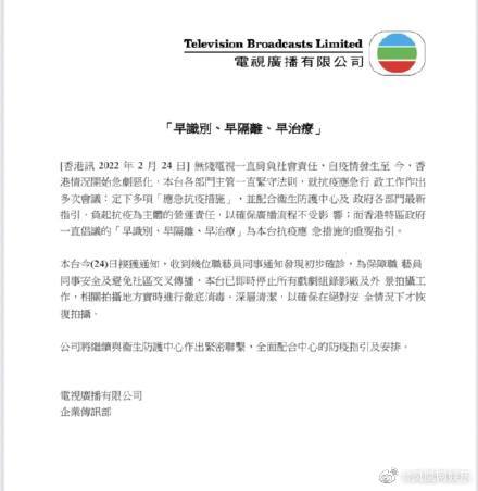 【#TVB宣布所有剧组全面停工#】2月24日,香港无线电视台(TVB)发布疫情公告,宣布所有剧组全面停工。通告中表示,TVB已停止所有剧组的录影及外景拍摄工作,将对相关拍摄地方进行消毒,确保在绝对安全的情况下才恢复拍摄。据悉,停工剧组包括《隐门》《法言人》《回归》《曙光》《爱·回家之开心速递》和《破毒强人》等。