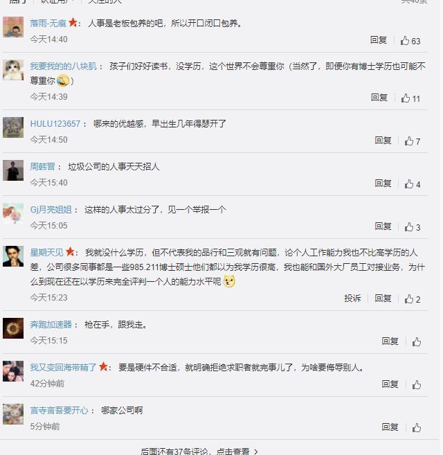 近日,深圳一 HR 在网上发与应聘者聊天内容,聊天记录显示,该 HR 说“没学历去找人包养吧”,配文称“求职者跟公司是互相选择的状态”。