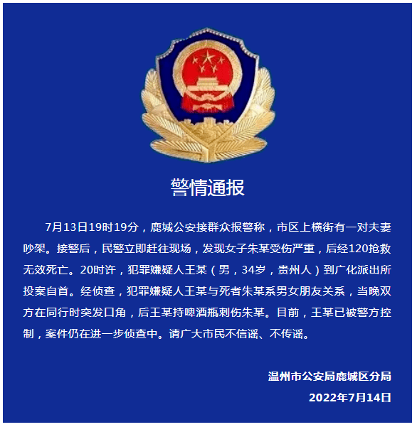 据媒体爆料称,2022年7月13日下午7点19分,在浙江省温州市上横街有一对夫妻吵架,当地警方接警后快速赶到现场,民警赶到的时候一名女子受伤斜躺在马路中间的护栏上,随后救护人员赶到后立即施救,奈何女子受伤严重不治身亡。事发现场并没有嫌疑人的踪迹,当晚8点左右,嫌疑人王某到派出所自首。14日警方发布通报,详细内容如下: