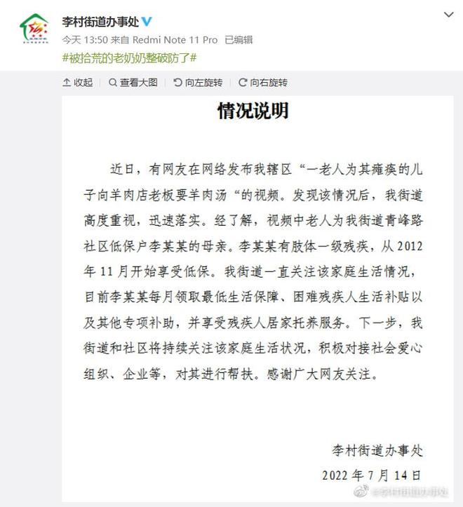 信网7月14日讯7月14日,李村街道办事处发布情况说明称,近日,有网友在网络发布辖区“一老人为其瘫痪的儿子向羊肉店老板要羊肉汤“的视频。发现该情况后,李村街道高度重视,迅速落实。
