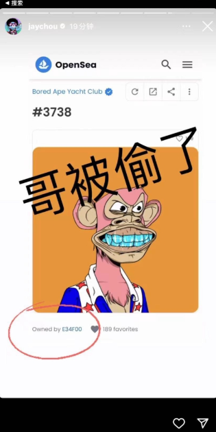 周杰伦在社交平台上发文称,其持有的 BAYC #3738 NFT 已被盗。据了解,该 NFT 在今年1月由黄立成(MachiBigBrother)赠送。
