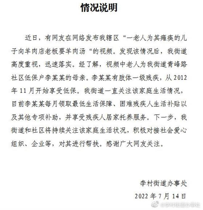 14日下午,山东省青岛市李村街道办事处发布情况说明称,“经了解,视频中奶奶为李村街道青峰路社区低保户李某某的母亲。李某某有肢体一级残疾,从2012年11月开始享受低保。街道一直关注该家庭生活情况,目前李某某每月领取最低生活保障、困难残疾人生活补贴以及其他专项补助,并享受残疾人居家托养服务。下一步,李村街道和社区将持续关注该家庭生活状况,积极对接社会爱心组织、企业等,对其进行帮扶。”