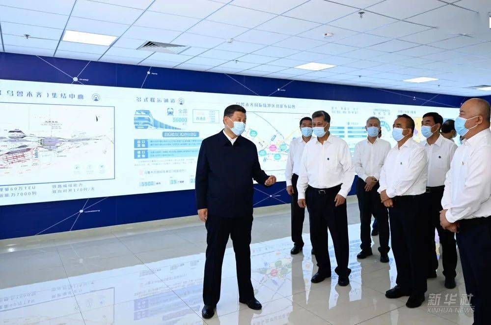 习近平总书记7月12日下午来到乌鲁木齐国际陆港区,听取整体情况介绍,通过实时画面察看中欧班列(乌鲁木齐)集结中心各功能区和阿拉山口口岸、霍尔果斯口岸现场作业情况,并同工作人员及现场办事人员亲切交流。