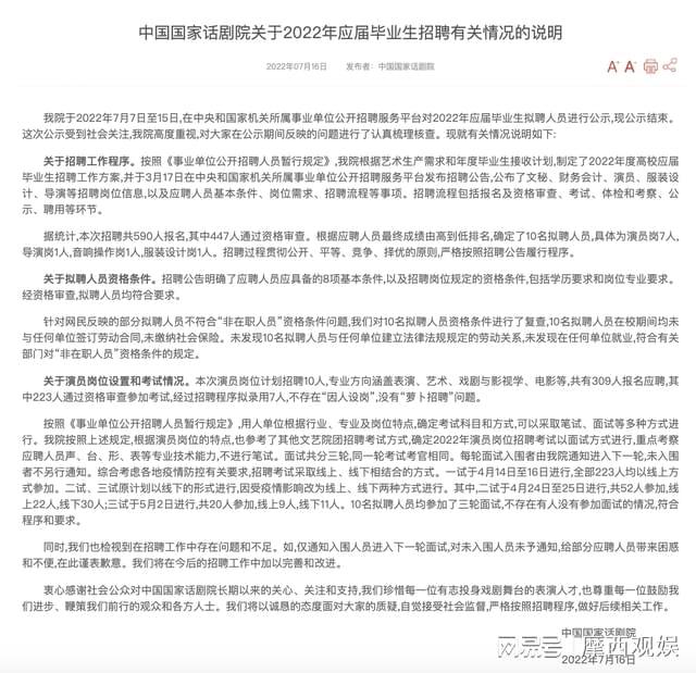 对于此事,此前国家话剧院已经回应过一次,当时说名单只是公示,并未正式录取。现在公示期刚刚过去,国家话剧院也正式回应了此事,据说国家话剧院非常重视,对整个招聘流程进行了复查。
