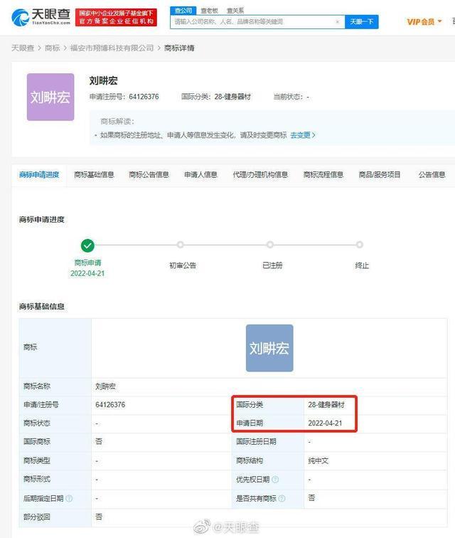 4月30日,天眼查App显示,近日“刘畊宏”商标被福建和香港两公司申请注册,国际分类包括健身器材、服装鞋帽等,当前商标状态均为“申请中”。另外,“刘畊宏女孩”也被广西一公司申请注册,国际分类为日化用品。