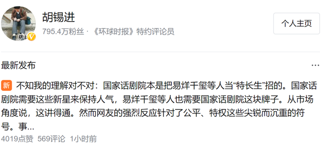 胡锡进认为国家话剧院需要这些新星来保持人气,易烊千玺等人也需要国家话剧院这块牌子。
