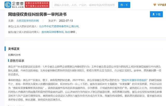民事判决书显示,华美紫馨整形未经井柏然团队授权,利用井柏然的肖像进行商品推荐和宣传,以此达到商业使用目的。