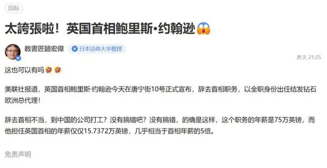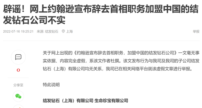 近日,有网传消息称,约翰逊当日已经在唐宁街10号正式宣布辞去首相职务,并将以全职身份出任中国某钻石公司的欧洲总代理。