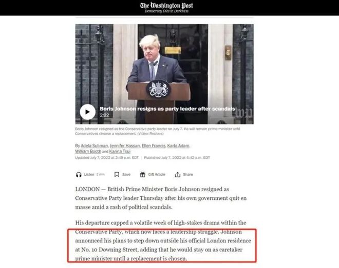 根据《华盛顿邮报》7月7日发布的报道显示,约翰逊在辞去党首职务时说道,他将作为看守首相留任,直至新的领导人产生。