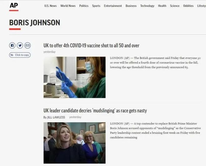 在美联社官网以“Boris Johnson”为关键词进行搜索,15日当天发布的4篇相关文章里,没有一篇提到过所谓的约翰逊将“辞去首相职务”“加盟中国公司”之事。