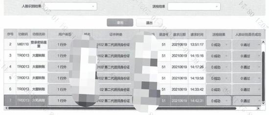 银行后台记录显示,李红的借记卡在6月19日那天共有7次操作涉及人脸识别,均显示识别成功通过,其中1次为借记卡申请,1次为登录密码重置,5次为大额转账,除了第一次不涉及活检,后6次操作“活检结果”均为成功。