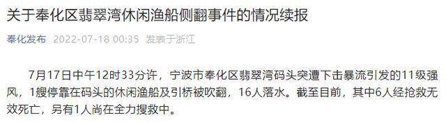7月17日中午12时33分许,宁波市奉化区翡翠湾码头突遭下击暴流引发的11级强风,1艘停靠在码头的休闲渔船及引桥被吹翻,16人落水。截至目前,其中6人经抢救无效死亡,另有1人尚在全力搜救中。