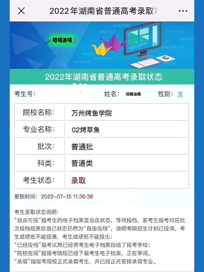 市民王先生反映,他在网上看到不少微博博主转发了一张“2022年湖南省高考录取状态”的截图。截图上的考生号和考生姓名被遮挡覆盖,其被录取的院校为万州烤鱼学院,专业为烤鱼专业,批次为普通批,考生状态为录取。