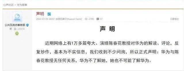 7月6日,华为发表声明指出,近期网络上有一万多篇夸大、演绎陈春花教授对华为的解读、评论,基本为不实信息。华为强调,“华为与陈春花教授无任何关系,华为不了解她,她也不可能了解华为”。