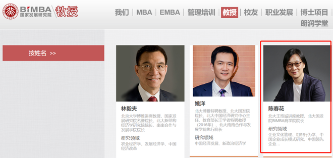 北京大学国家发展研究院官网信息显示,陈春花现任北大王宽诚讲席教授、北大国发院BiMBA商学院院长,研究领域涉及企业文化管理、组织行为学、中国企业成长模式研究等。曾两次获评《财富》“中国50位最具影响力商界领袖”;蝉联四届《财富》“中国最具影响力25位商界女性”。出版著作近30本,“领导力与高效能组织”线上课程曾入选首批国家级一流本科课程;曾三次获得教育部高等学校人文社科优秀著作奖。