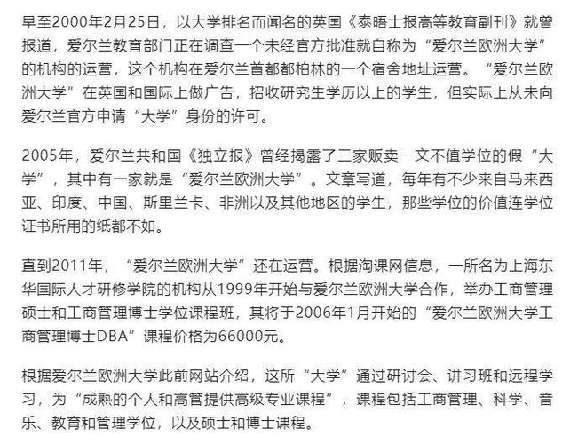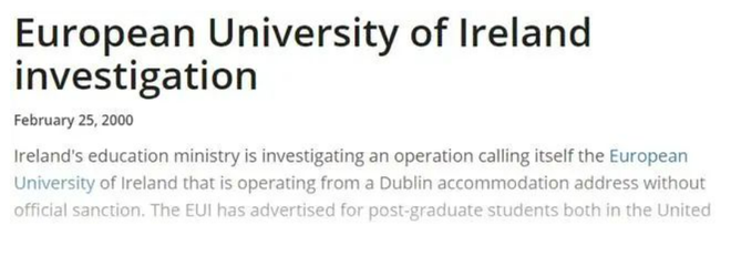 不仅如此,早在2000年,英国泰晤士报旗下以高等教育为主题的网站The Higher Education,就曾发表报道《调查“爱尔兰欧洲大学”》。文中提到,爱尔兰教育部门正在调查一个未经官方批准就自称为“爱尔兰欧洲大学”的行为。