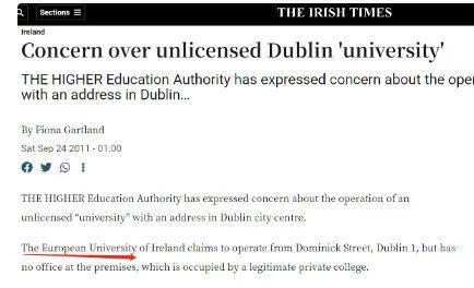 2011年,爱尔兰时报网站曝光了“爱尔兰欧洲大学”无牌照经营的现状。文中提到,该学校自称在都柏林市多米尼克大街1号运营,但在该地址并无设立办公室,该地址是另外一家合法的私立大学。