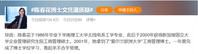 进而人们开始聚焦她的学历。头衔众多的陈春花1986年毕业于华南理工大学无线电系工学专业,获学士学位,此后于2000年获得新加坡国立大学企业管理研究生院工商管理硕士。而一年以后,即2001年,她已经拿到了“爱尔兰欧洲大学”工商管理博士。