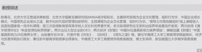 北大关于陈春花的教育背景,也仅仅写了:南京大学商学院企业管理博士后(2005),没有其他任何本硕博的文凭介绍。