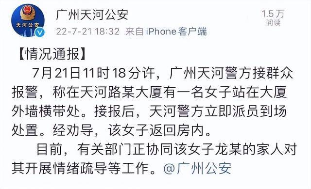 7月21日11时18分许,广州天河警方接群众报警,称在天河路某大厦有一名女子站在大厦外墙横带处。接报后,天河警方立即派员到场处置。经劝导,该女子返回房内。