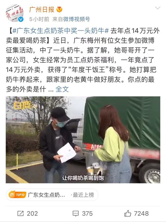 7日,“广东女生点奶茶中奖一头奶牛”话题冲上了微博热搜榜第8位,截至目前,已经有超过57万次搜索。