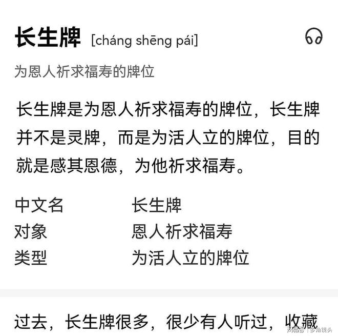 长生牌是为恩人祈求福寿的牌位,长生牌并不是灵牌,而是为活人立的牌位,目的就是感其恩德,为他祈求福寿。