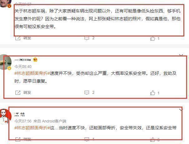 网友认为,车速那么慢,就算是撞车,林志颖也不至于会受这么重的伤,唯一的可能就是没系安全带。副驾驶上坐着小儿子,有可能林志颖正在和他说话分心了,又或者低头捡东西,没掌握好方向盘,导致发生了意外。