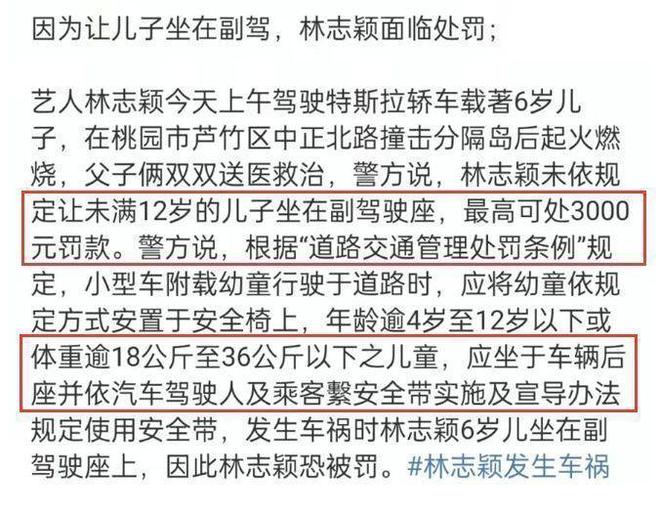 除此之外,林志颖让未满12岁的儿子坐副驾驶,其实也是违规的。6岁的儿子由于系上了安全带,他只有一点皮外伤,本人吓得不轻,但并没有哭,表现得非常坚强。因为林志颖没系安全带,所以撞车后出现了多处骨折,才会造成这么严重的后果。