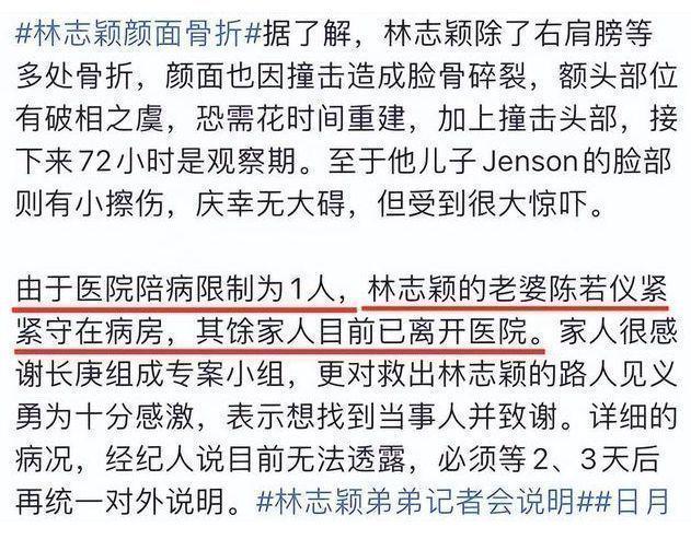 此外,林志鑫透露,接下来的两天比较关键,除了透露身上多处骨折外,林志颖的面部也遭受到骨折,而且还要请用整形医生一起操刀,会不会面临毁容,目前还是一个未知数,可见林志颖虽然脱离了生命危险,但伤势还是相当严重。
