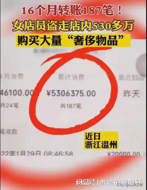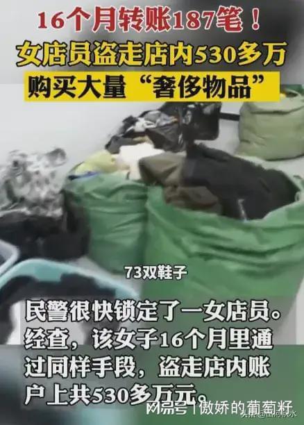 16个月从店里转出538万元。警方从她家里搜出16大袋、8大箱名牌手表、包、化妆品等,包括390件衣服,260条裤子,73双鞋子,38个包,8个眼镜,16条项链,化妆品数都数不清,还有几只手表,总价值100多万元。