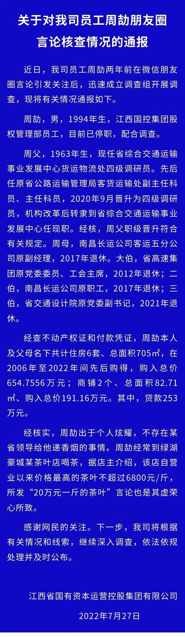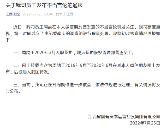 此前,7月25日,江西国控集团发布情况通报:近日,我司员工周劼在本人微信朋友圈发表的不当言论引发关注。我司高度重视,第一时间成立了由纪委牵头的调查组进行核查处置。现将初步核查情况通报如下: