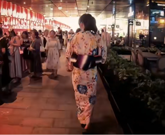 此外,活动现场还出现了不少身穿和服、脚踩木屐的人,在活动现场进行捞金鱼、打西瓜等日本夏日祭传统风俗。