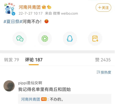 日前,未来网报道了网络上饱受争议的夏日祭事件(此前报道:),截止到记者发稿时,贵州贵阳、广东韶关、广西桂林、山东枣庄、山西大同、辽宁铁岭、云南楚雄、云南大理、江西新余、江苏南京等多地均已取消夏日祭活动。@河南共青团 明确表示,夏日祭河南不办!