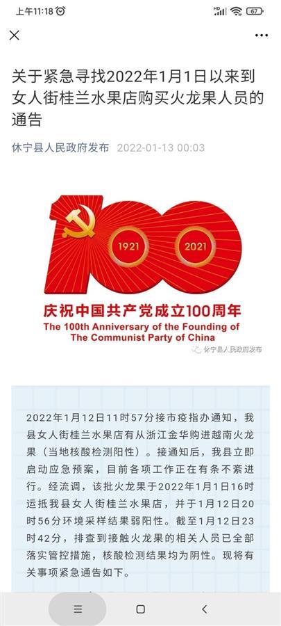 极目新闻记者注意到,就在休宁警方发布通报当日,休宁县新冠疫情防控指挥部办公室发布通告称,紧急寻找2022年1月1日以来到桂兰水果店购买火龙果人员。通告称,2022年1月12日11时57分,接市疫指办通知,该县女人街桂兰水果店有从浙江金华购进越南火龙果(当地核酸检测阳性)。经流调,该批火龙果于2022年1月1日16时运抵我县女人街桂兰水果店,并于1月12日20时56分环境采样结果弱阳性。截至1月12日23时42分,排查到接触火龙果的相关人员已全部落实管控措施,核酸检测结果均为阴性。