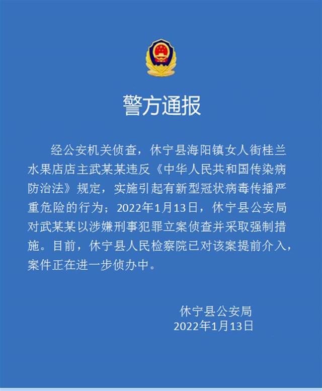 1月13日,安徽休宁警方发布通报称,该县水果店主武某某实施引起有新型冠状病毒传播严重危险的行为,警方对其以涉嫌刑事犯罪立案侦查并采取强制措施。当地商户介绍,武某某此前从浙江金华购入一批越南火龙果,在金华防疫部门已公开通报该批火龙果外包装核酸阳性后,武某某未及时上报信息,仍继续销售,多日后该店环境采样结果为弱阳性。