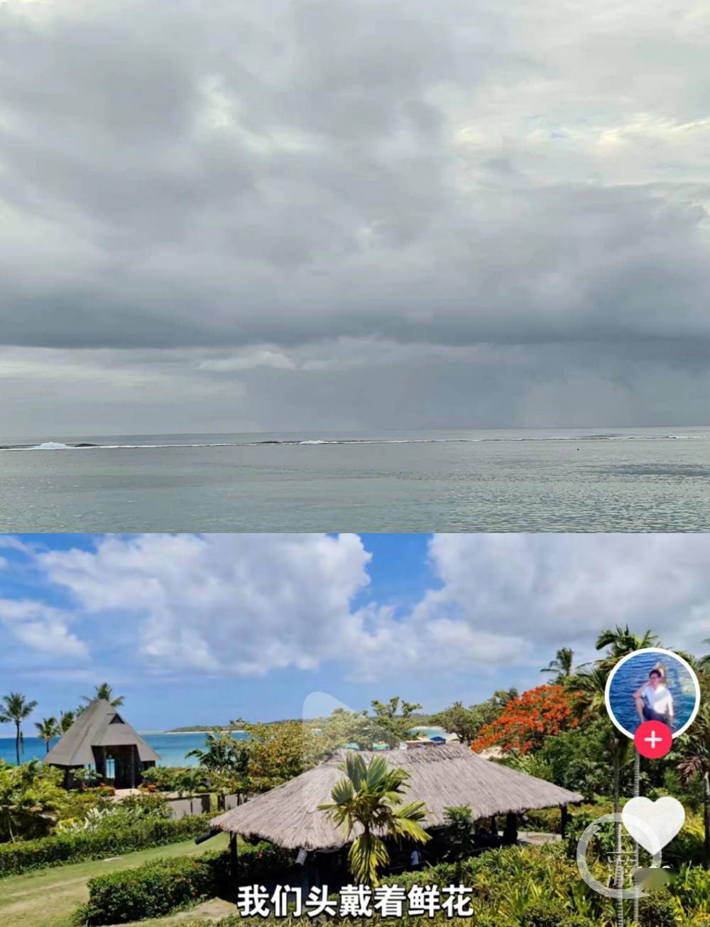 火山灰下的斐济天空(上)与平时的斐济天空(下)