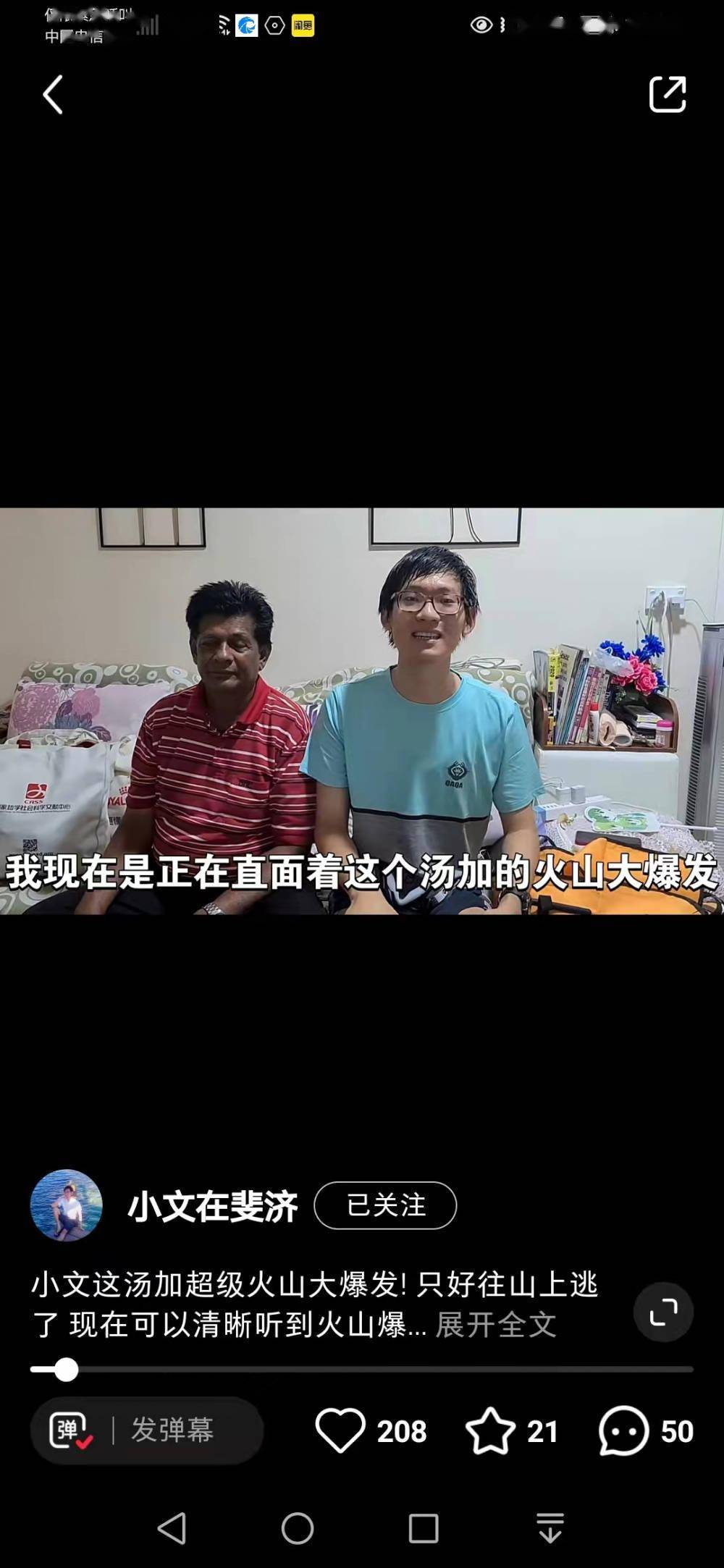 1月16日,“小文在斐济”在社交平台发布视频表示,自己目前在斐济,正直面汤加火山的喷发,火山灰明早(17日)就会到斐济。为了应对,他早早备好了吃的、救生器材以及防毒面具。视频里,他始终面带微笑,神情淡定,网友评价:“你怎么还笑笑的,很开心的样子”。他在另一个视频里表示,“官方已经发了消息,说是海啸警报目前已解除,有惊无险!后续,火山灰和酸雨可能会持续一段时间,希望能挺过去。”