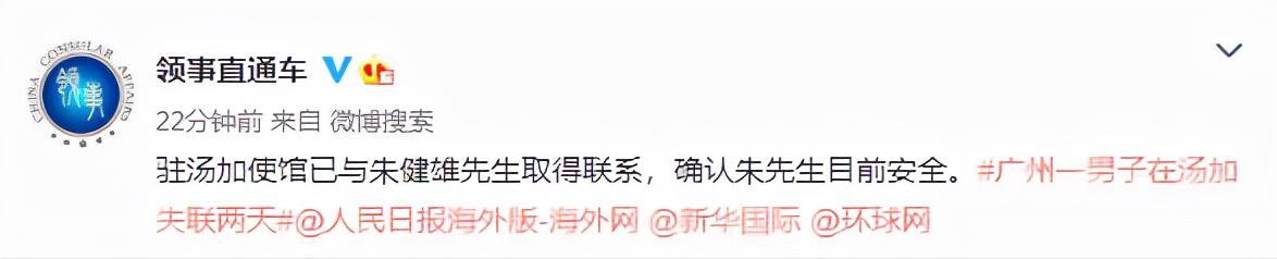 17日晚,@领事直通车发布微博称,驻汤加使馆已与朱健雄先生取得联系,确认朱先生目前安全。
