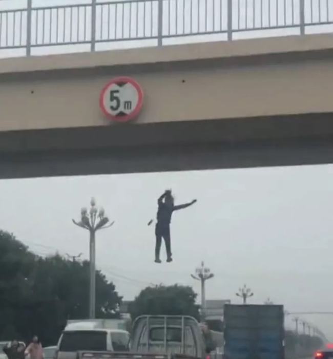 面对众人的劝阻,女子都没听进去,一心想结束自己的生命。趁大家不注意,一个纵身跳了下去,万幸的是,女子跳下去的瞬间,被一辆路过的小货车完美接住。司机立即停车,随后该女子被旁人救下。估计小货车司机也被吓了一大跳,好端端的开在路上,天上都能掉个人下来,幸好是接住了。