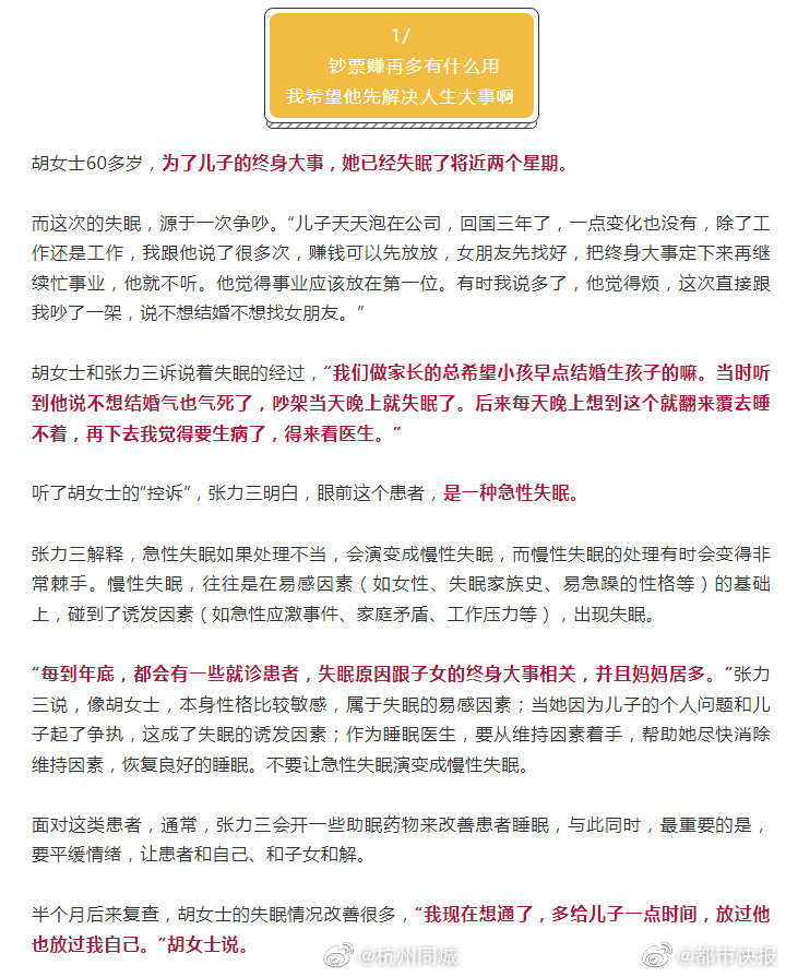 【#母亲因儿子哈佛毕业不结婚急到失眠# 】最近,邵逸夫医院睡眠门诊,接诊了不少急性失眠患者。上周,60多岁胡女士来看病,“我睡不好。儿子30多了,1.8米,长得像金城武。3年前美国哈佛大学毕业回来,忙着打拼事业,管理上市公司……他还不找,我急得半个月都睡不着。”医生表示,这是急性失眠。“每到年底,都会有些患者,失眠跟子女终身大事相关,并且妈妈居多。最重要的是要让患者和自己、子女和解。”对此你想说?via@都市快报