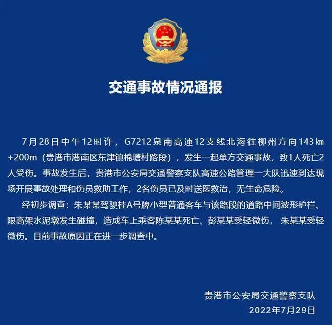 29日,贵港市公安局交通警察支队发布情况通报称,7月28日中午12时许,G7212泉南高速12支线北海往柳州方向143km+200m(贵港市港南区东津镇棉塘村路段),发生一起单方交通事故,致1人死亡2人受伤。