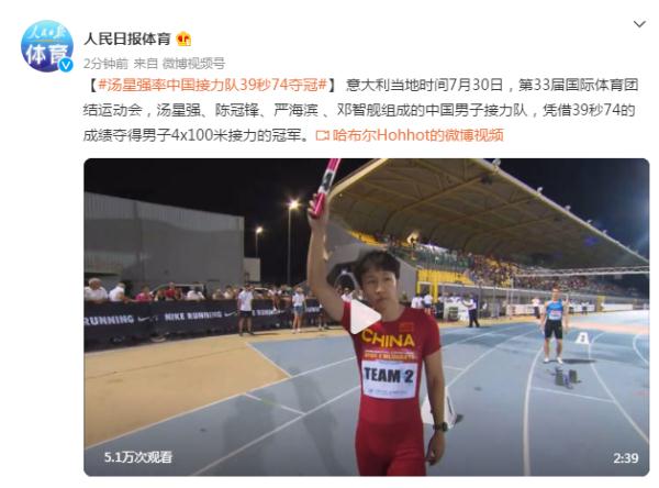 意大利当地时间7月30日,第33届国际体育团结运动会,汤星强、陈冠锋、严海滨 、邓智舰组成的中国男子接力队,凭借39秒74的成绩夺得男子4x100米接力的冠军。(来源 人民日报体育 五星体育 责任编辑 徐诗雨)