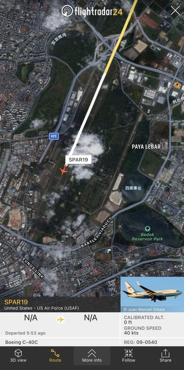 FlightRadar24显示的佩洛西专机C-40C降落新加坡巴耶利峇空军基地截图